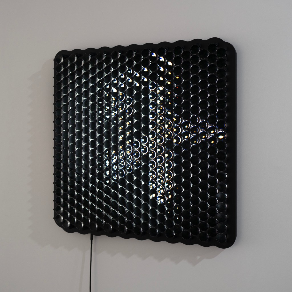 Finally, on the sixth floor of the gallery, Reworld transforms its window into an optical apparatus that reorders our visual comprehension of the city. Thousands of diamond-cut micro-prisms, each operated by a precise electromechanical system, fragment and reorganise the sky, trees, buildings, shadows, and streets of the urban landscape into composite images. Whereas previous versions of the work used AI to orchestrate the prisms, here the artists have taken direct control.