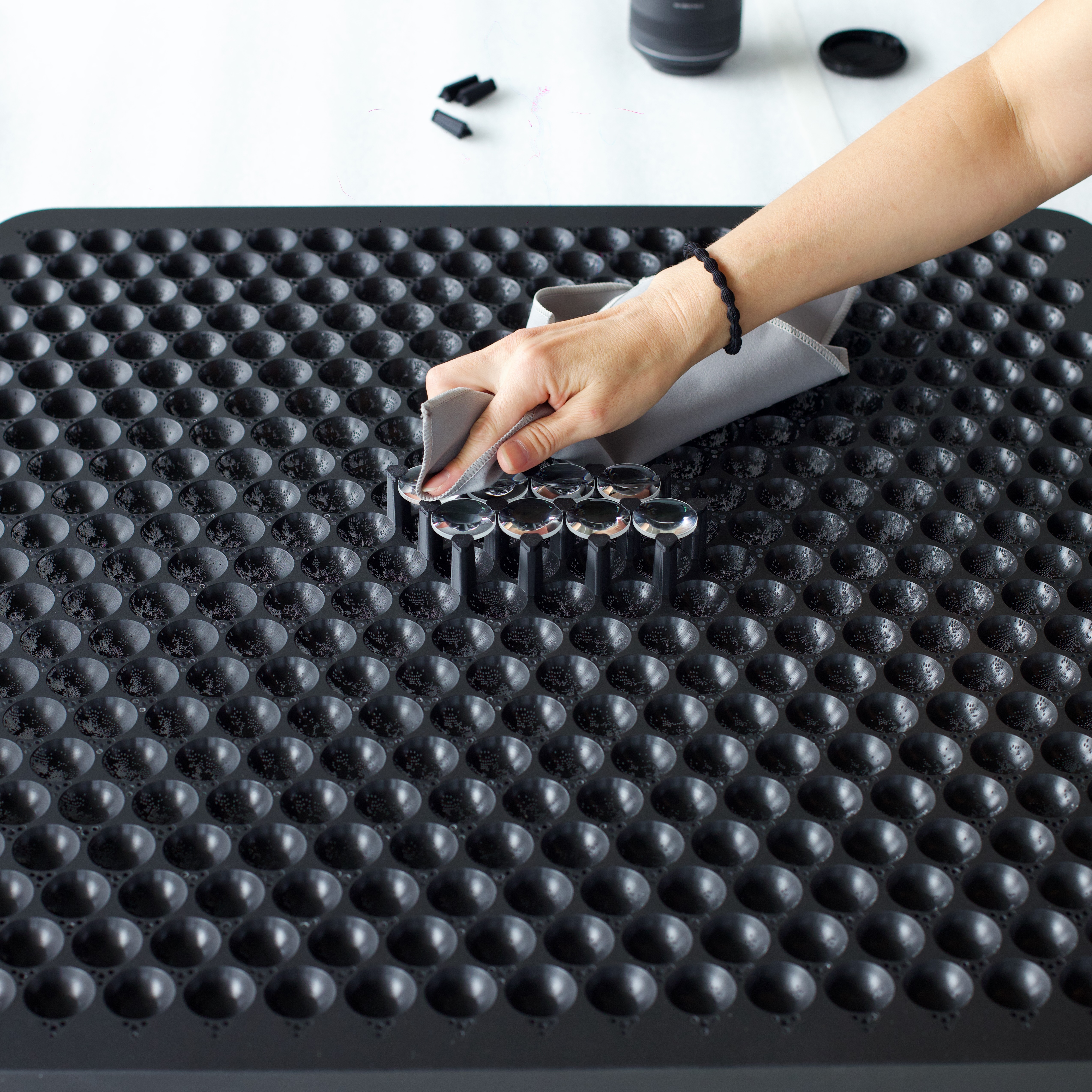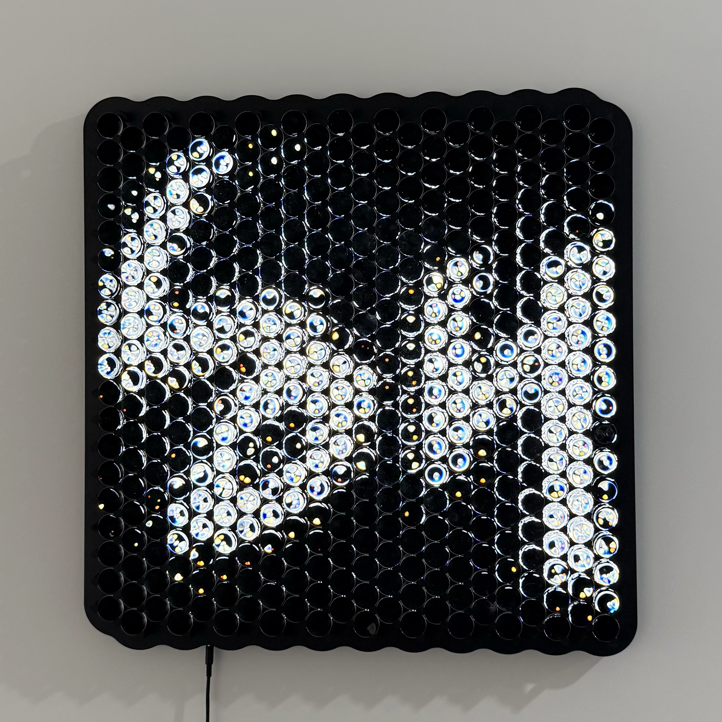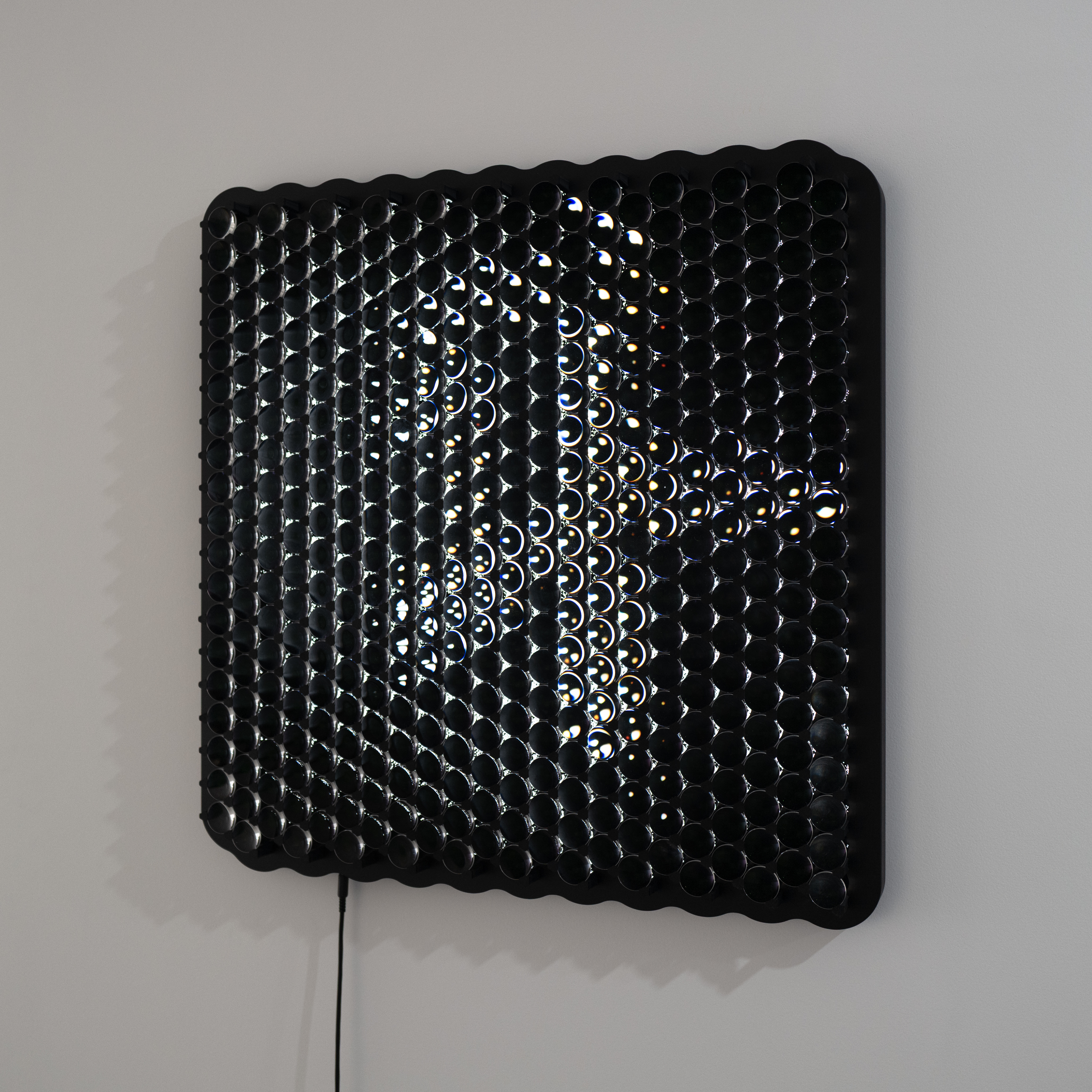 In Series 5, digitally printed backplates are overlaid with moving lenses. As the lenses traverse the surface, they release hidden rhythms and convert the motionless into the motionful. In Series 6, arranged fabric replaces printed plates. The weave and texture become the source of unexpected animations. Each material holds latent movement, which the lenses draw into visibility.