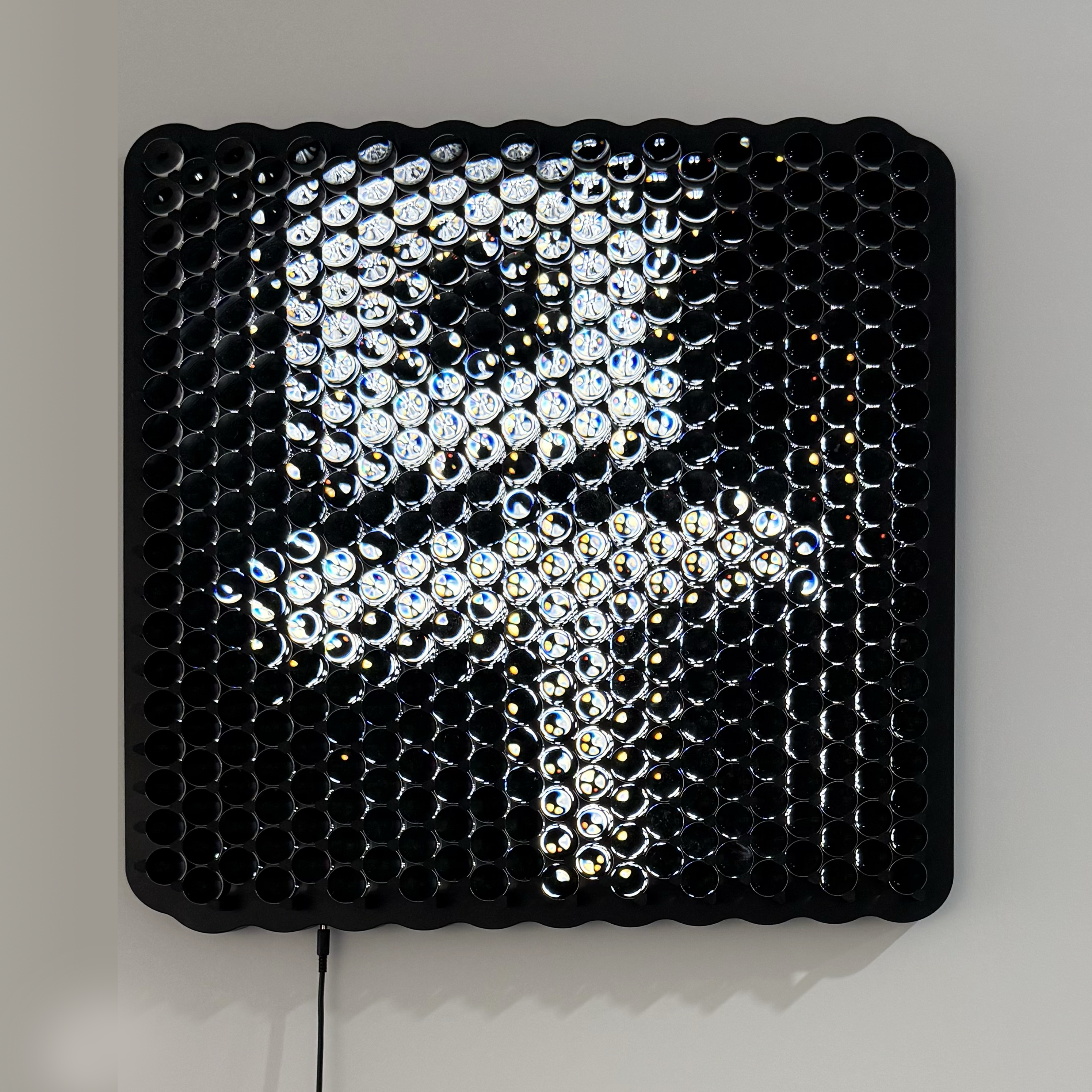 Finally, on the sixth floor of the gallery, Reworld transforms its window into an optical apparatus that reorders our visual comprehension of the city. Thousands of diamond-cut micro-prisms, each operated by a precise electromechanical system, fragment and reorganise the sky, trees, buildings, shadows, and streets of the urban landscape into composite images. Whereas previous versions of the work used AI to orchestrate the prisms, here the artists have taken direct control.