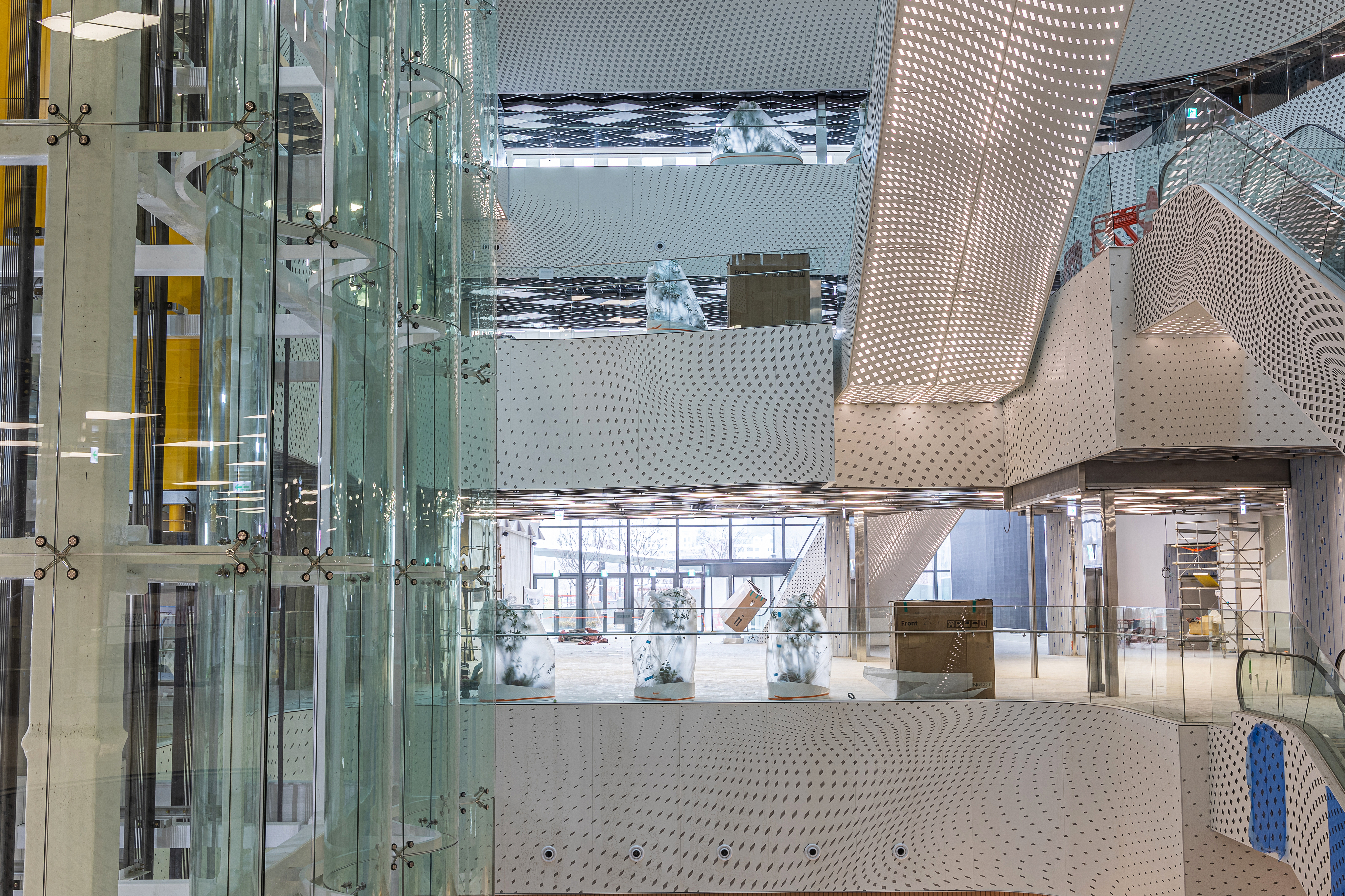 The atrium’s large façade and the central elevator media wall of the complex feature works that symbolize the harmony and circulation of nature and humanity.