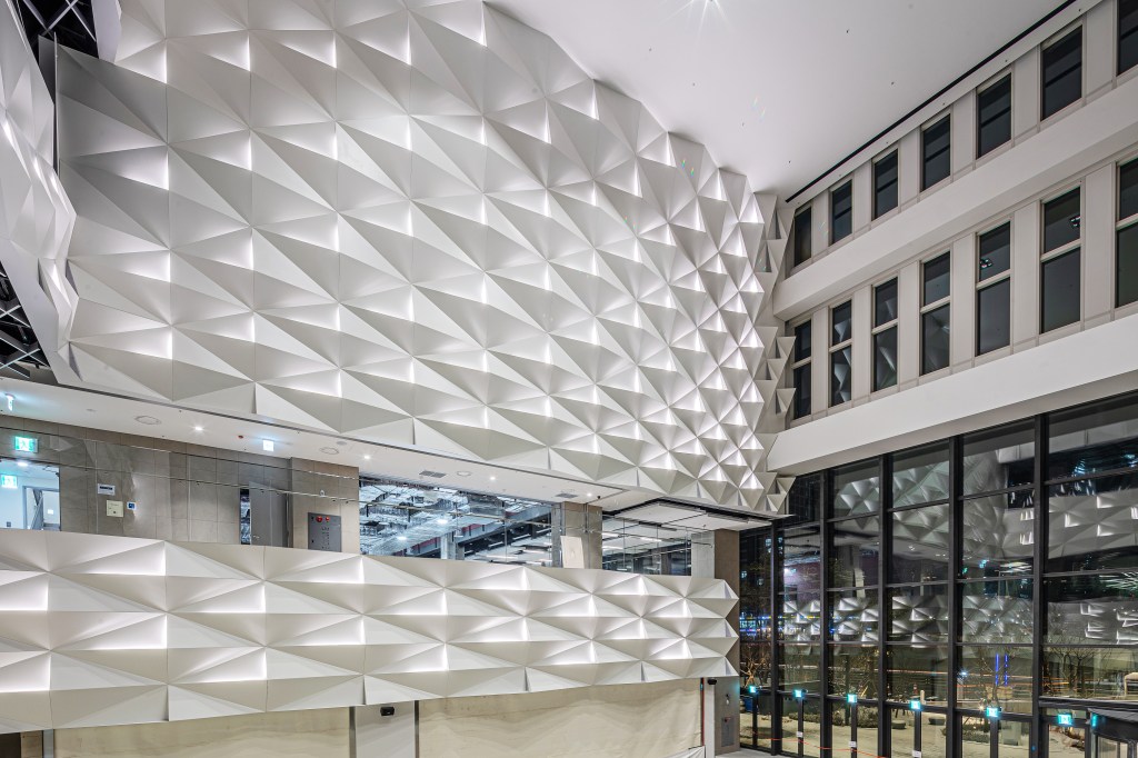 - Commercial Façade Pattern: We initially intended to use the same pattern above throughout the commercial façade, but budget and construction constraints led us to adjust the design. We shifted to a flowing, wave-like pattern of triangles and rectangles, introducing a subtle movement to the space while minimizing distraction from the bustling mall scene. A Halftone Net Pattern derived from Won-Bang-Gak was punched into stainless steel with internal lighting for a soft shimmer.