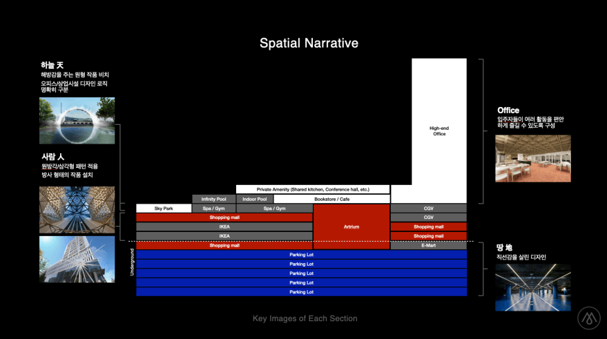 The project offers plenty of variety, but it wasn’t clear that this actually makes people want to experience the space. This complex comprises five floors of underground parking, five floors of commercial space, a food court, an outdoor park, a community space, and 12 floors of officetels. It’s a mix of functions, so it was crucial to have them converge into a single narrative to feel cohesive.