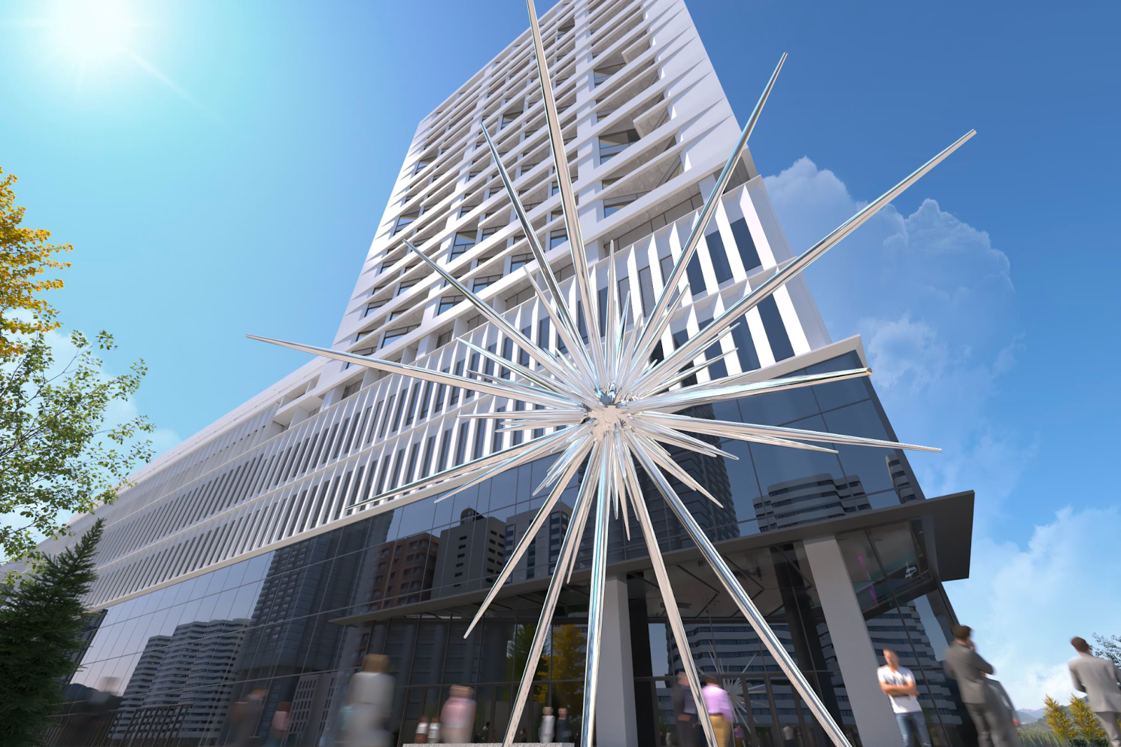 Made of chrome for easy maintenance, the sculpture emits a gentle glow from its center at night, becoming an iconic landmark in the area.