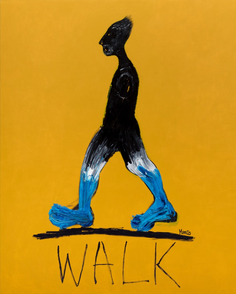 그중 바람에 휘날리듯 산뜻 떠오르는 개체가 캔버스 중심에 솟는다. 우직한 두발로 앞을 대차게 걷는 Walk의 형상들은 배경을 뚫듯 휘날리며 걸어간다. 스쳐 가는 바람처럼 아랑곳 않고 내딛는 발걸음은 목적지를 찾기보다는 걷는다는 행위를 통해 때로는 희망차게, 때로는 막연하게 걸음을 내딛는다. 흘러가는 시간을 의지를 담은 두발로 계속해서 – continue – 표기하듯 말이다.”